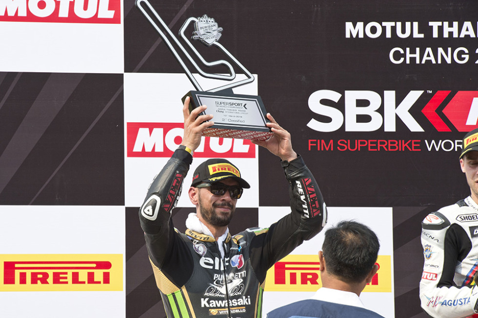 Kenan Sofuoglu scored second place for his first points and first podium of the season after 17 hard laps around the 4.554km Buriram circuit in Thailand today. His team-mate Randy Krummenacher (Kawasaki Puccetti Racing) took a close fourth place in the second round of the FIM Supersport World Championship. In the points table Krummenacher still leads with Sofuoglu now fourth.