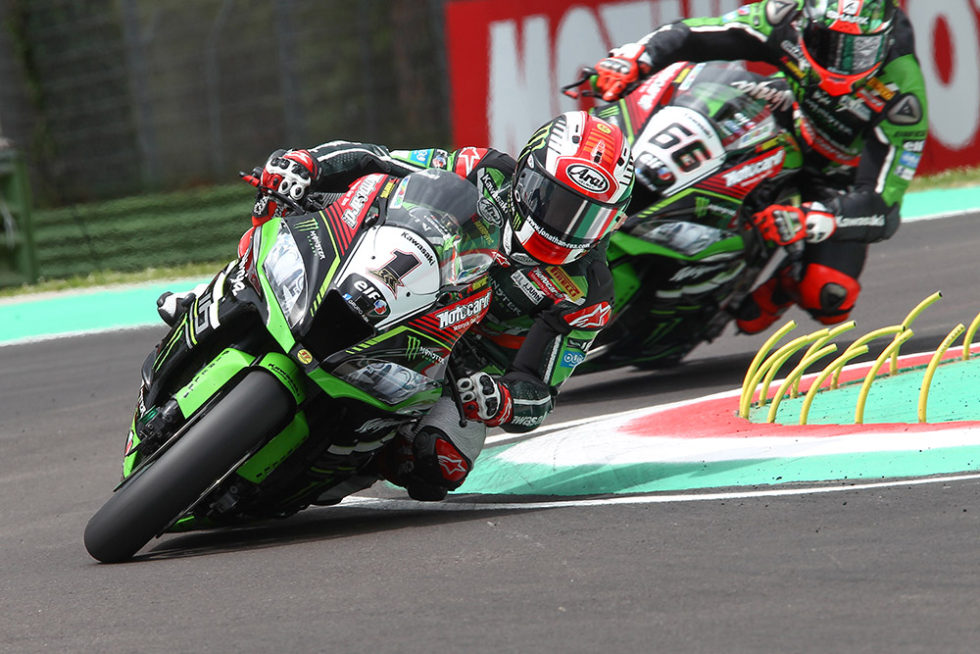Jonathan Rea and his KRT team-mate Tom Sykes stood on the podium for the second time in two days at Imola, with Rea once more second and Sykes again a close third on their all-new Ninja ZX-10Rs. Jonathan now has a championship lead of 35 points while Tom is third, 32 points from overall second place.