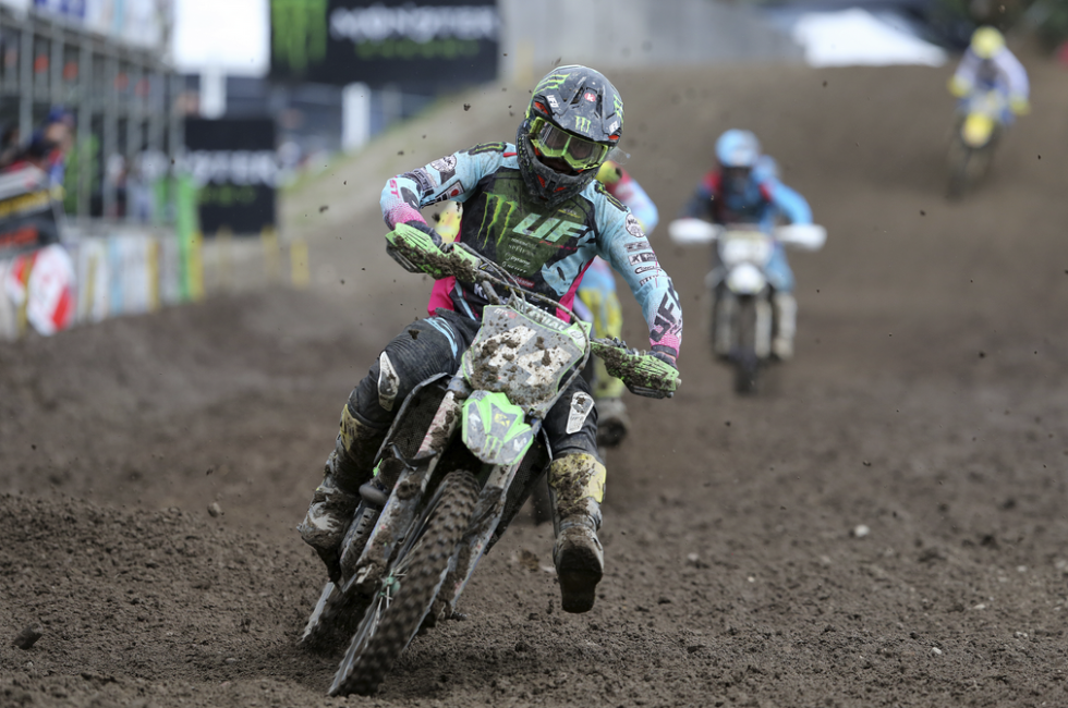 Incessant showers made racing even more difficult at the rugged track a few miles from the North Sea coastline but American rookie Darian Sanayei defied the conditions to repeat the speed he had shown one week earlier in Switzerland. He raced the two series title rivals throughout the qualifying moto to finish a close third, and was again prominent on race day, even if he was not quite able to repeat the level he had achieved twenty-four hours earlier. Starting sixth, he dropped one position early in the moto but came back strongly at the end of the moto to finish sixth with consistent lap times all moto and followed this up with a ninth placed finish in race two to complete the GP eighth overall. He maintains twelfth place in the series standings despite being forced to sit out a couple of mid-season GPs and has every chance of a final top ten ranking as he scored more heavily than either of the riders immediately before him in the points chase.