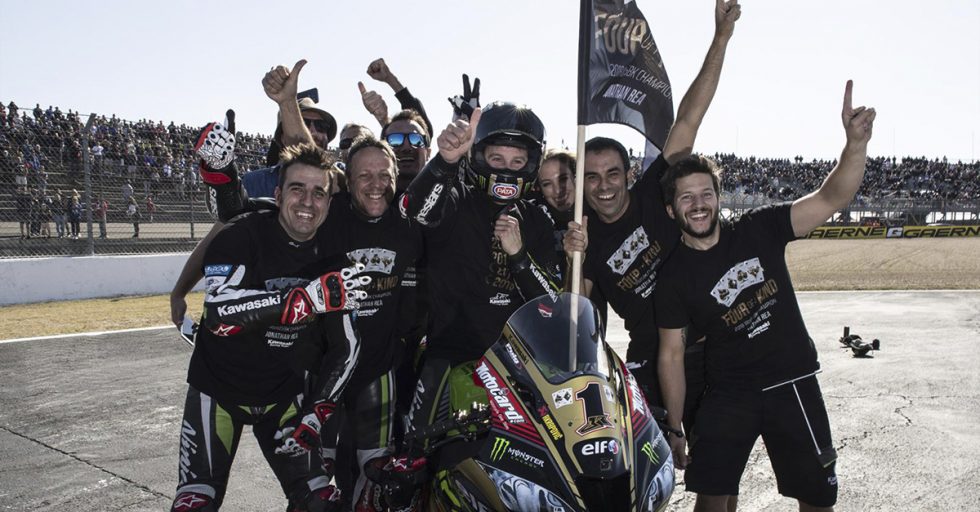 Jonathan Rea, stated: “It is absolutely incredible to win four. Sometimes even after winning back-to-back championships, or three in a row I have to say it is hard to find words to speak about what you have just done. It is like we are riding the wave now with our Ninja ZX-10RR, with incredible people around me. Whilst I always dreamed of being in this position I never thought it to was realistic. It was so fitting that Guim, the team manager, allowed my dad to come and collect the team award on the podium. I got really choked up when he came up because it just reminded me of growing up in Northern Ireland and travelling all round with my parents to motocross races. Then getting my first pro ride in roadracing, and my parents letting go. But they have always had my back. So that was super-nice. Pere and my team gave me a great bike this weekend and the target was clear. We have been in this position before, so there was no kind of nervousness or anxiety around, it was really positive energy. On track Fabien has been analysing what we can do and the team worked super-hard all weekend to get the best out of the bike when the tyre was dropping. In the hot conditions, at the end of the race, that is what we worked towards today. The feeling with the bike just kept coming and I was able to knock it off on the last lap and take it all in. I was aware of the crowd there and what I was about to achieve so that last lap there I thought about winning the championship. It is incredible, and incredible journey.”