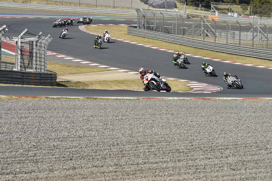 …27 bikes jumped off the line and headed down the long main straight fanning out 5 abreast into the first corner. Van Breda tried to push up the inside and take the holeshot but it was Gous who had the advantage of carrying a few extra kilometers into the turn. Behind them, the Bridgestone R11 tyres were being pushed hard through the left and right combination of the Jukskei Sweep jostling for position. Gous led the way in the early stages and was pushing to put Van Breda’s unbeaten winning streak to an end. Gous led the way for the opening laps but could not drop Van Breda.