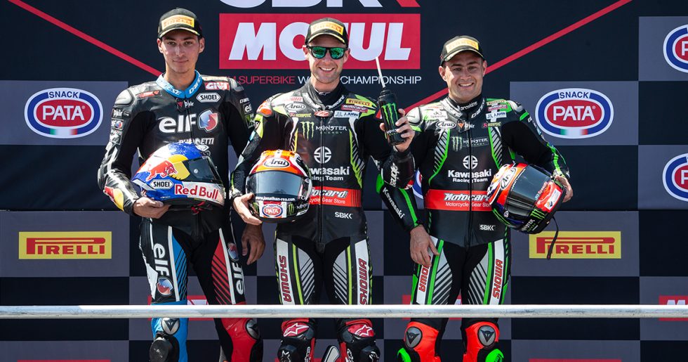 Jonathan Rea (KRT) finished fifth and then first in the two WorldSBK races at Misano today and with his team-mate Leon Haslam third in Race Two, and Toprak Razgatlioglu (Turkish Puccetti Racing) second, it was an all Ninja ZX-10RR podium. Rea has cut Alvaro Bautista’s championship lead to just 16 points this weekend.